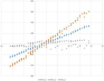 NT-ARS 센서에 온도를 올리고 내리는 실험을 통해 온도 변화에 따른 출력 데이터를 모으고 이를 엑셀의 그래프로 그려 보았습니다. 데이터가 원점 근처에 모여있는것은, 온도에서 25도를 빼고 센서 출력 데이터에서도 평균을 빼서 그래프를 그렸기 때문입니다. 가속도 센서의 데이터(accl_x_c, accl_y_c, accl_z_c)가 각속도 센서의 데이터(gyro_x_c, gyro_y_c)보다 온도 변화에 영향을 더 크게 받는 것을 볼 수 있고 그래프의 모양도 대략 선형을 띄고 있습니다. 일이 아주 쉬워질 것 같습니다. ^^